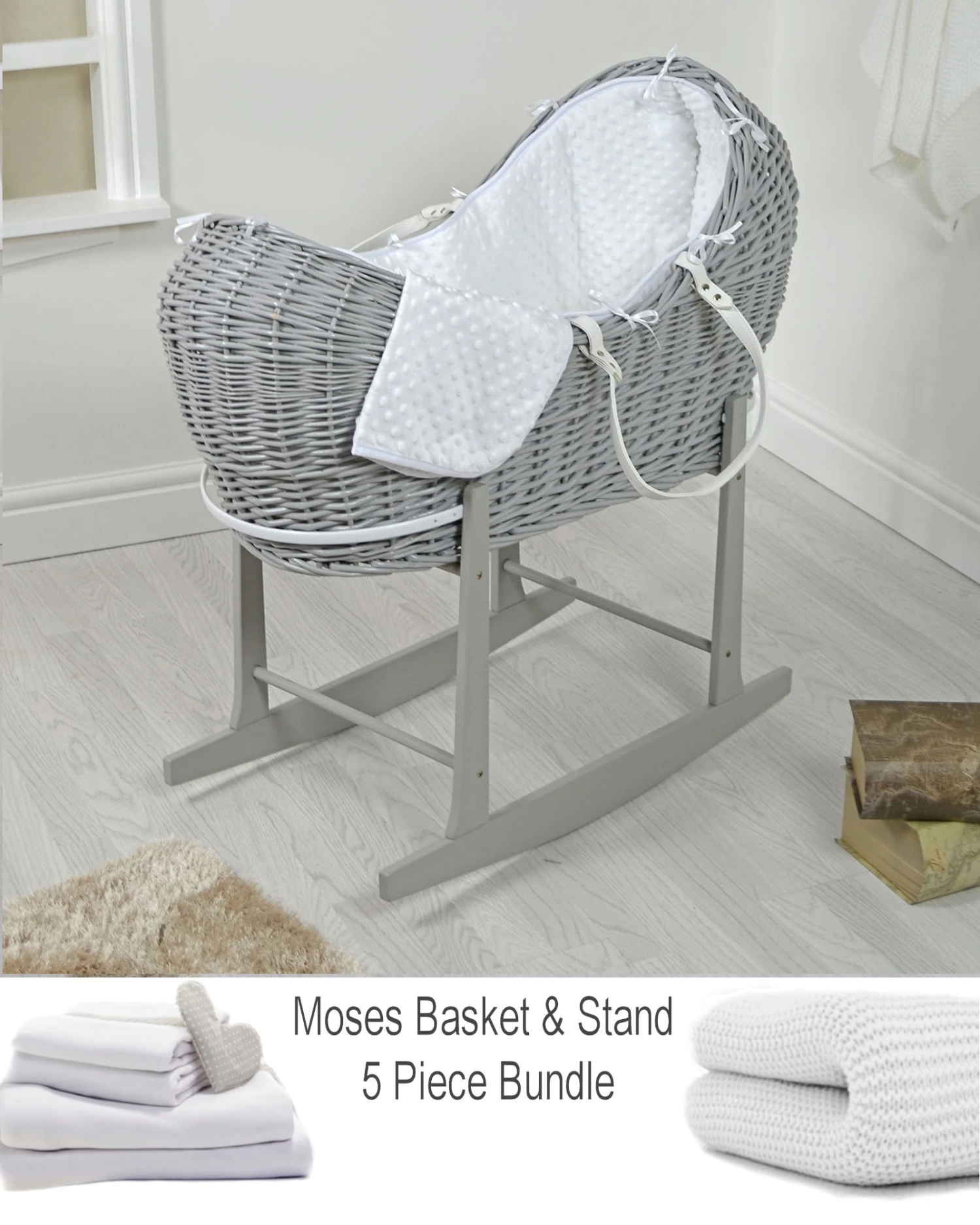 4baby Deluxe 5 Piece Grey Wicker Sleep Pod Moses Basket – White Dimple