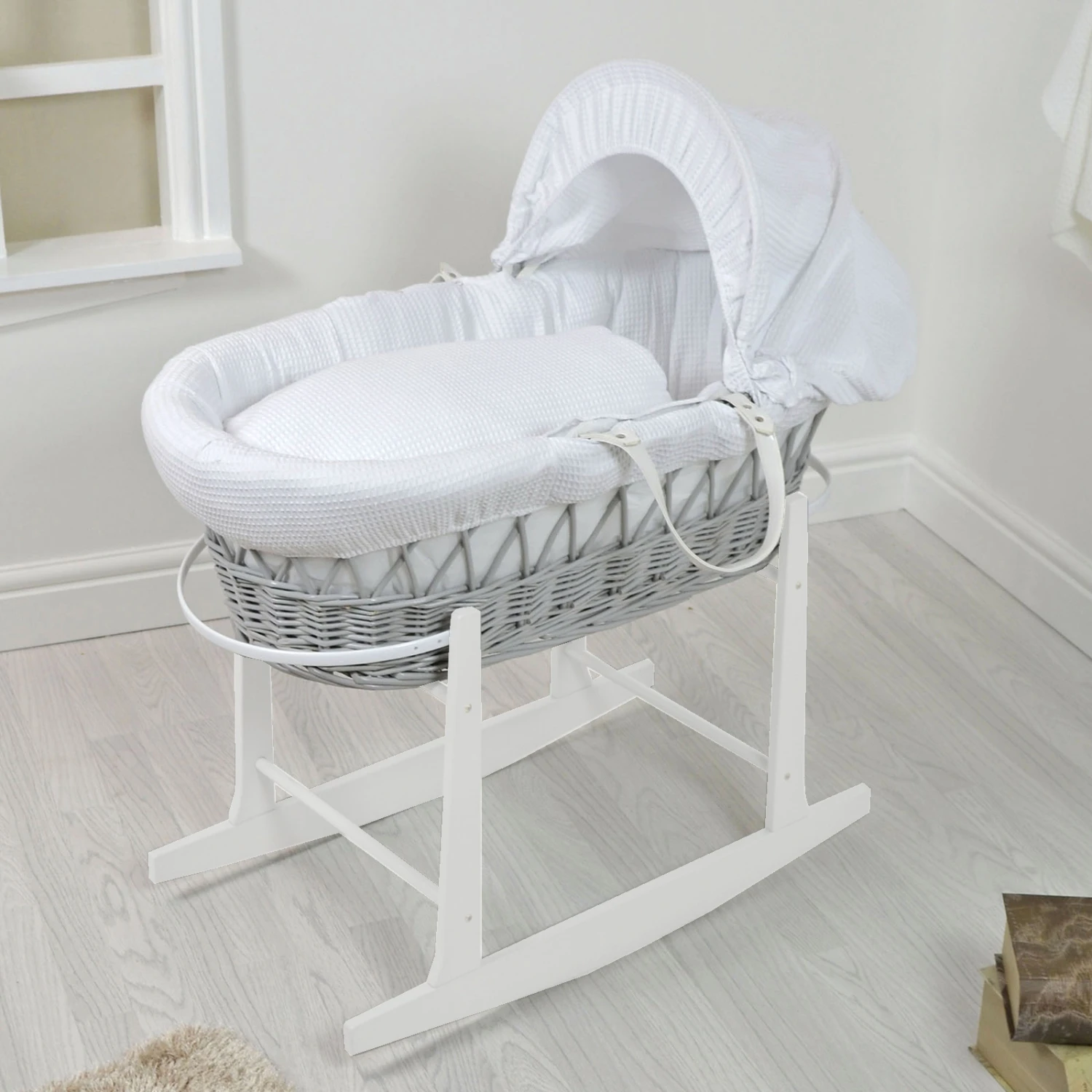 4Baby Padded Grey Wicker Moses Basket & Rocking Stand – White Waffle