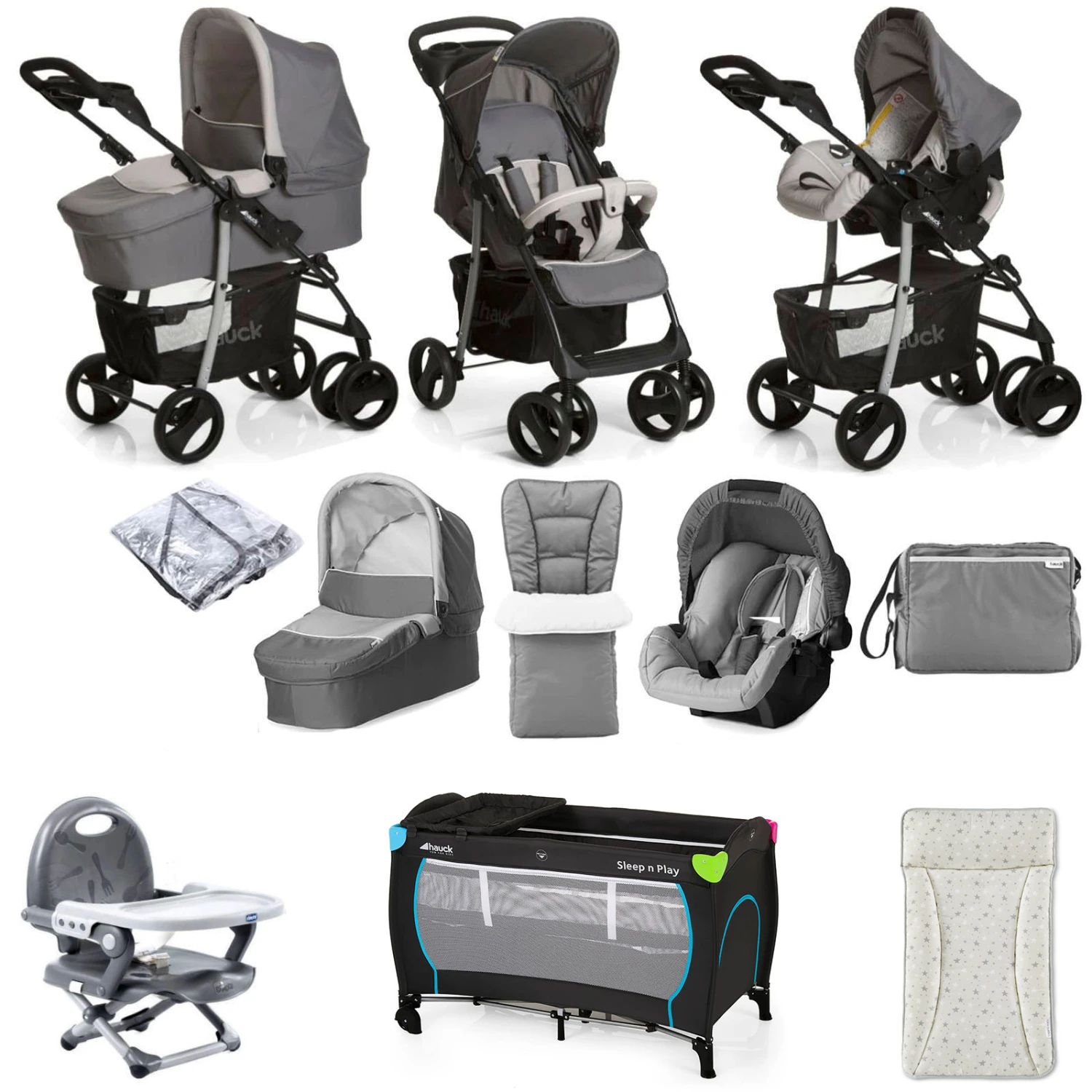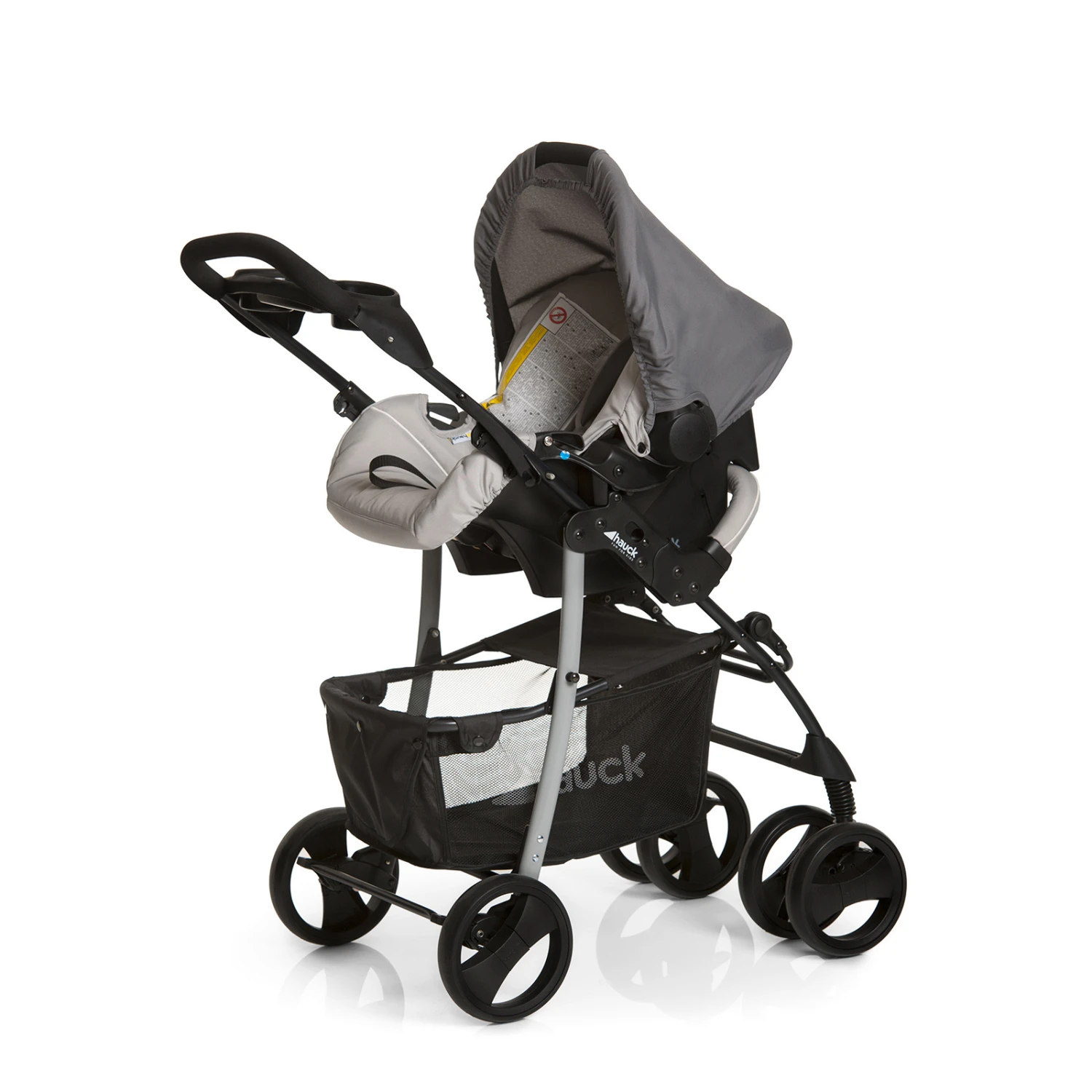 The Hauck Shopper Trio Set Travel System includes pushchair, hard carrycot, car seat, footmuff, changing bag & raincover. Its lightweight, robust frame and extra-large wheels and suspension make an easy job of tackling the toughest of terrains, and shop ‘til you drop with the large shopping basket, parent tray and handy cup holders.