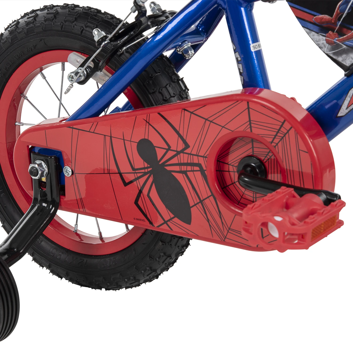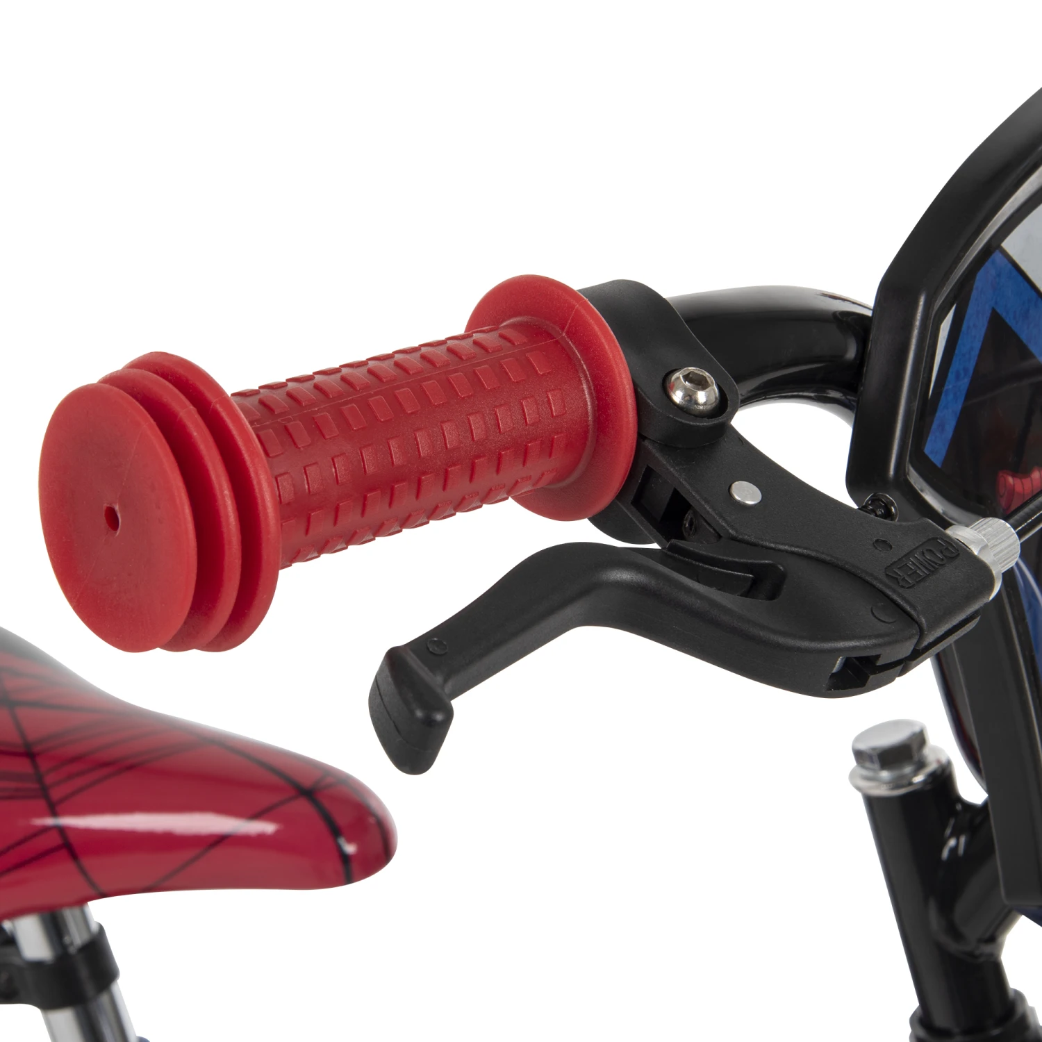 Marvel Spider-Man Design: Super graphics of Spider-Man and webs decorate the handlebar plaque, frame, chainguard, and training wheels of this bike to give it mighty look. Safety and Comfort: Your child will feel safe and in control of every ride with the two training wheels, fully enclosed chainguard, front and rear sidepull hand brakes, and comfortable padded seat.