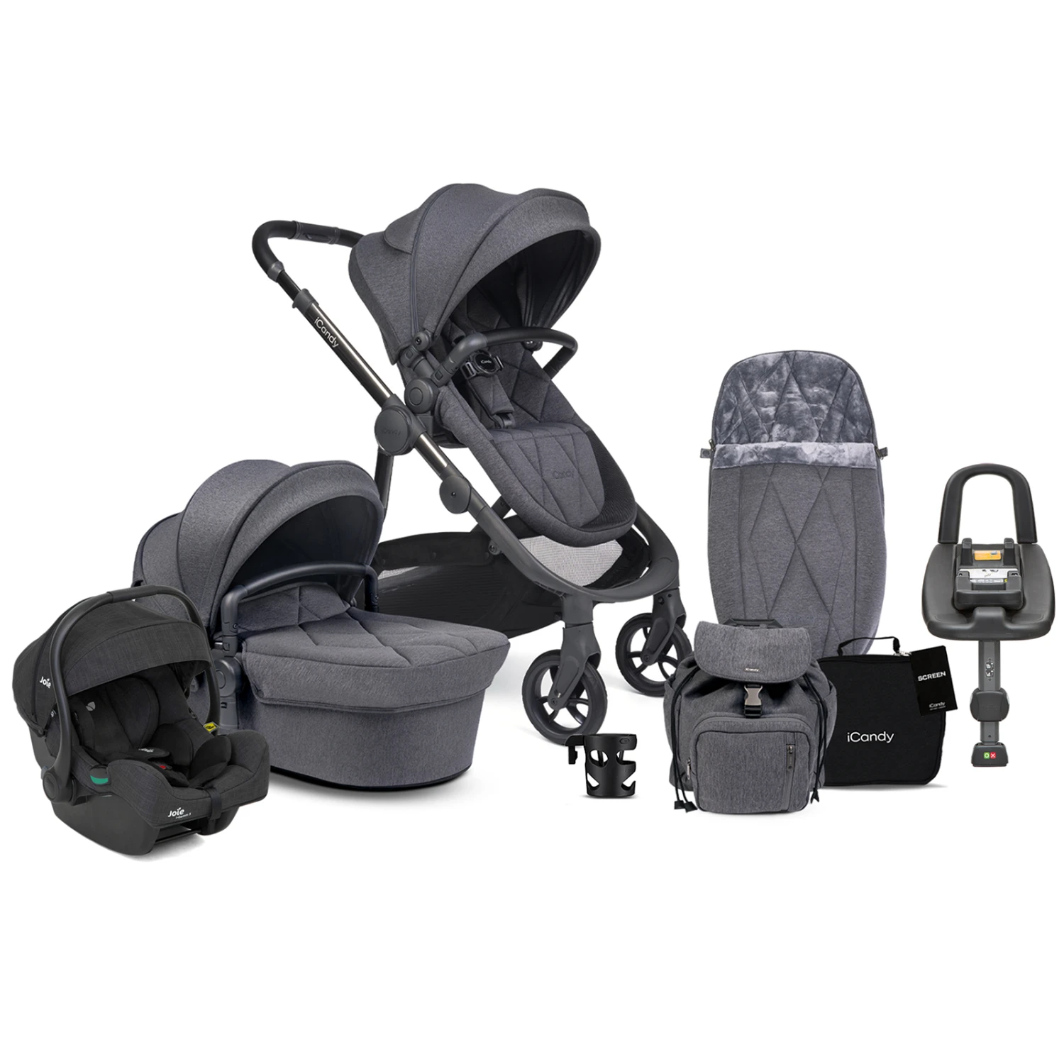 iCandy Orange 3 Complete 14 Piece Travel System Bundle with i-Gemm 3 Car Seat & ISOFIX Base – Dark Slate Marl Phantom