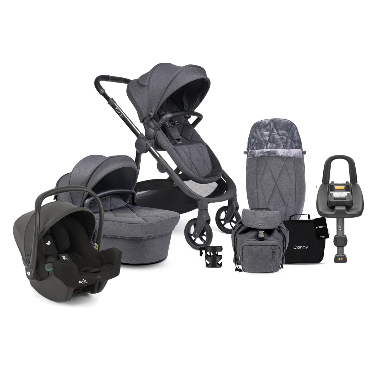 iCandy Orange 3 Complete 14 Piece Travel System Bundle with i-Snug 2 Car Seat & ISOFIX Base – Dark Grey Marl Phantom