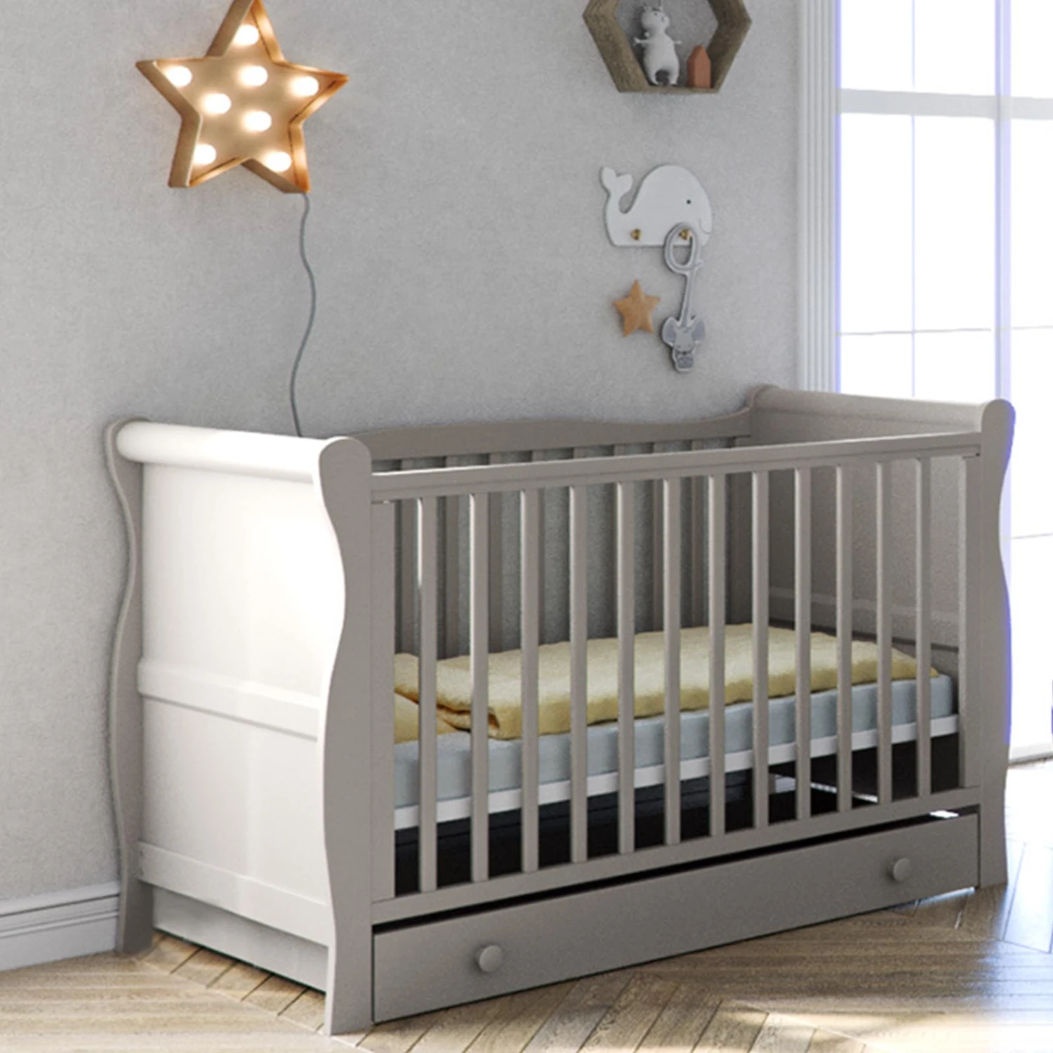 Little Acorns Sleigh Cot Bed With Mini Uno Essential Spring Cot Bed Mattress – White 140 x 70cm & Drawer – Grey