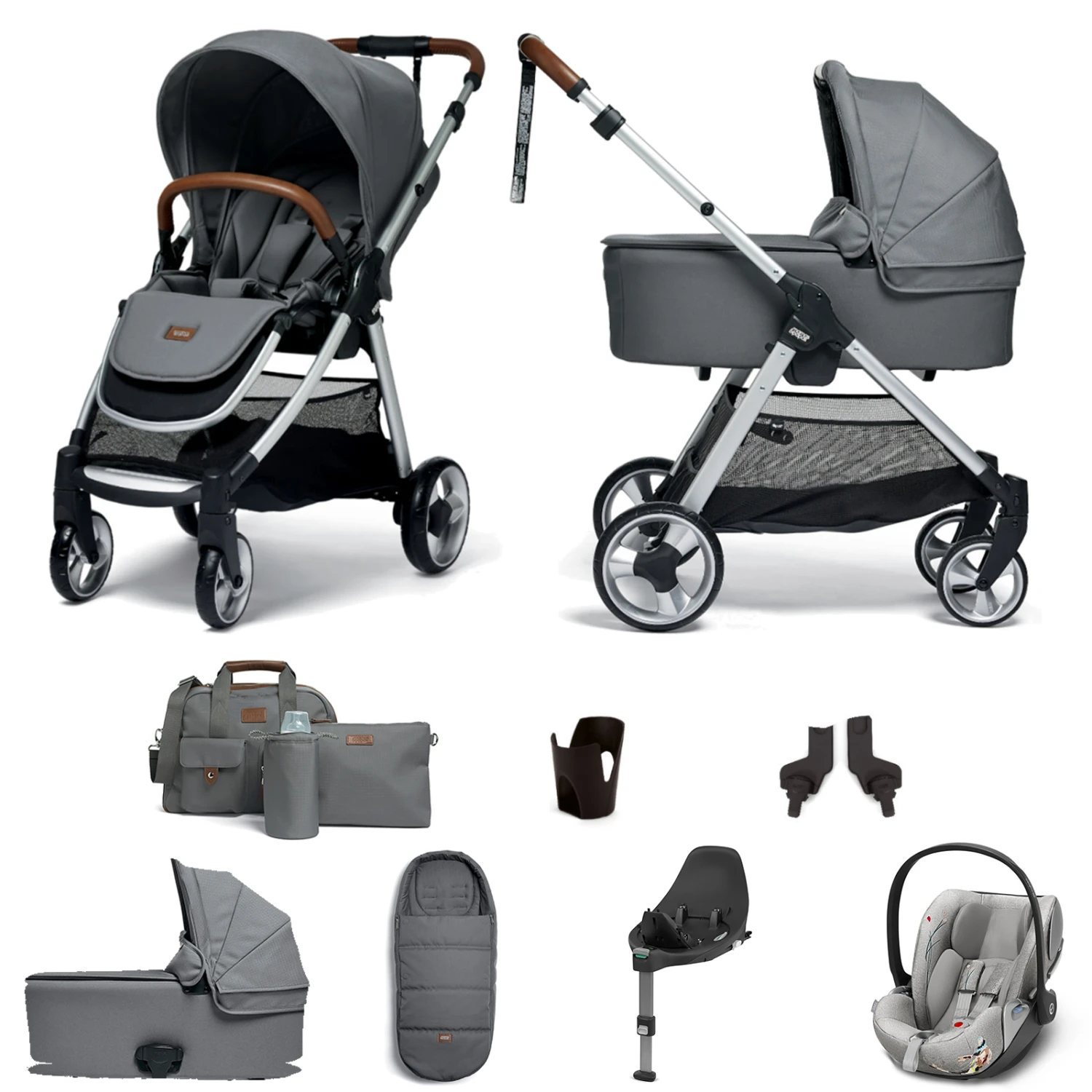 Mamas & Papas Flip XT2 Essentials (Cloud Z Car Seat & ISOFIX Base) Travel System with Carrycot, Footmuff & Changing Bag – Fossil Grey