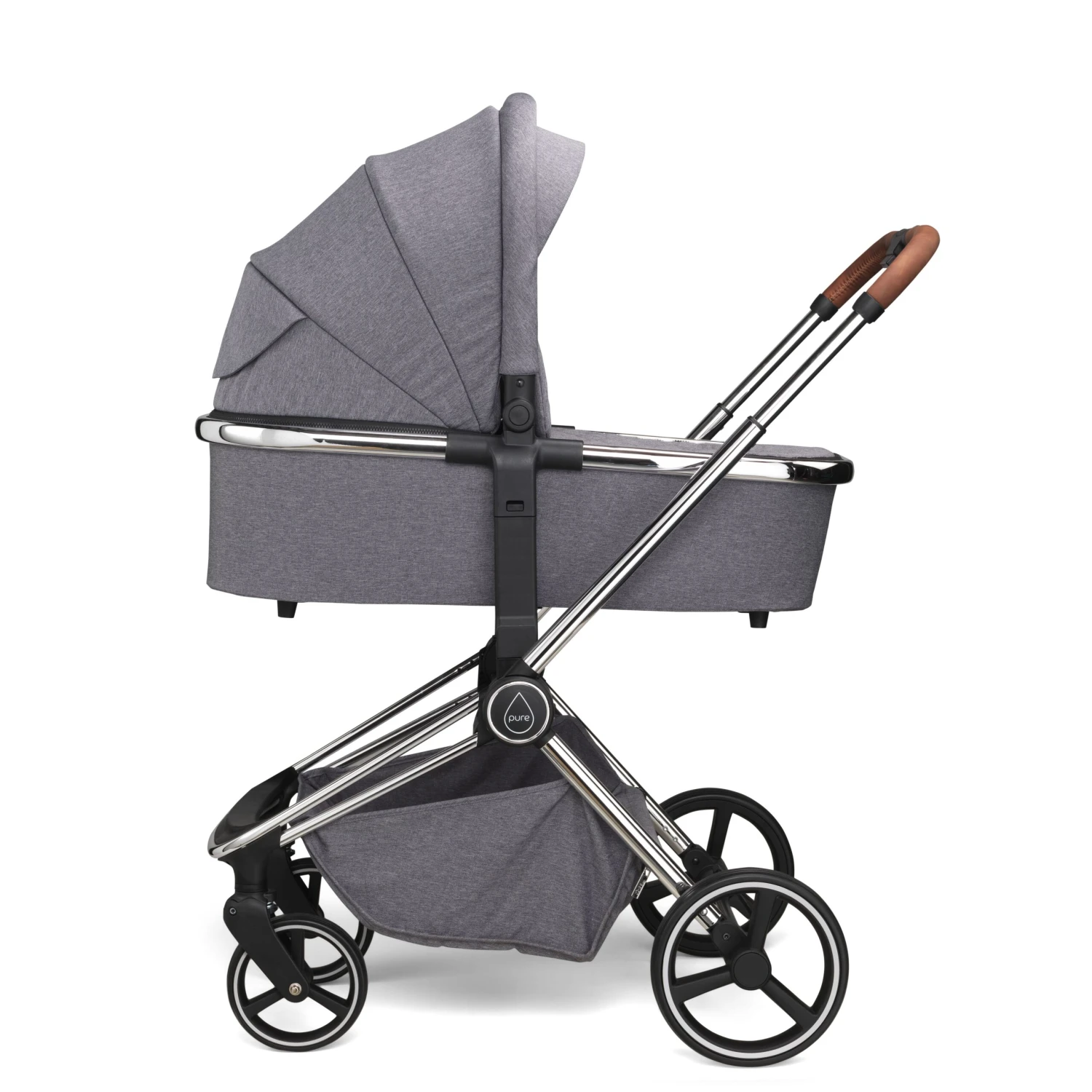 In addition, the Pure stroller comes fully equipped with all those must have essentials including a matching designer mama bag, footmuff, raincover, mosquito net as well as a pair of multi car seat adapters, that allows you transform this luxury pushchair and carrycot into a stylist, must have travel system.