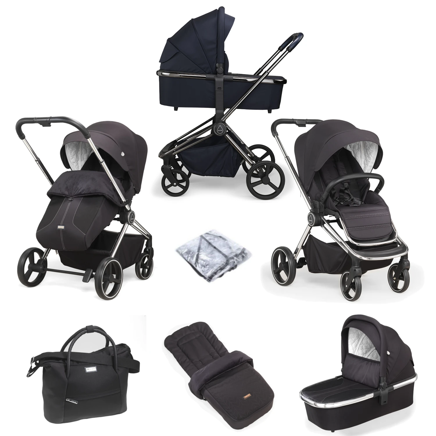 In addition, the Pure stroller comes fully equipped with all those must have essentials including a matching designer mama bag, footmuff, raincover, mosquito net as well as a pair of multi car seat adapters, that allows you transform this luxury pushchair and carrycot into a stylist, must have travel system.