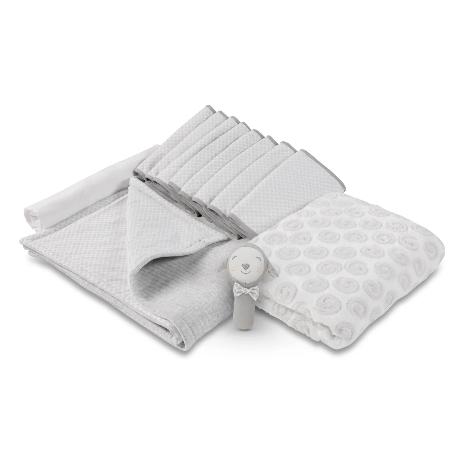 This beautiful infant bedding set is the perfect gift for any newborn baby. All the items are produced in high quality fabrics and finishes and feature a gorgeous lamb swirls design and a delightful lamb character.
