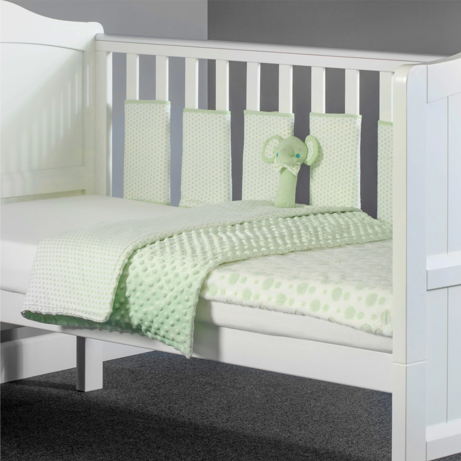 Mini Uno Little Ellie Elephant 5 Piece Cot / Cot Bed Quilt, Bumper, Blanket Bedding Set – Sage Spots