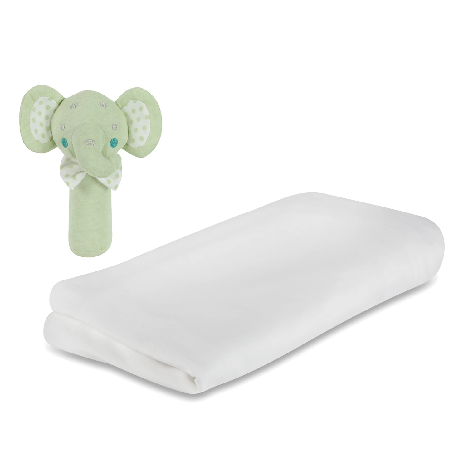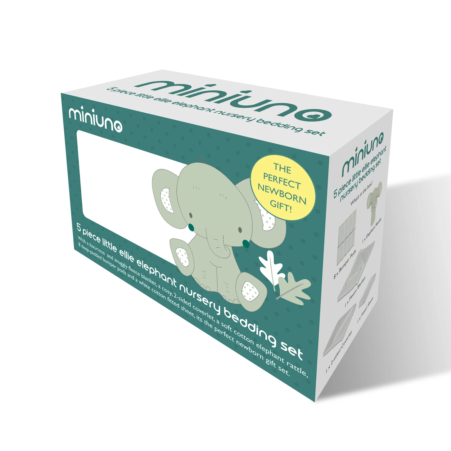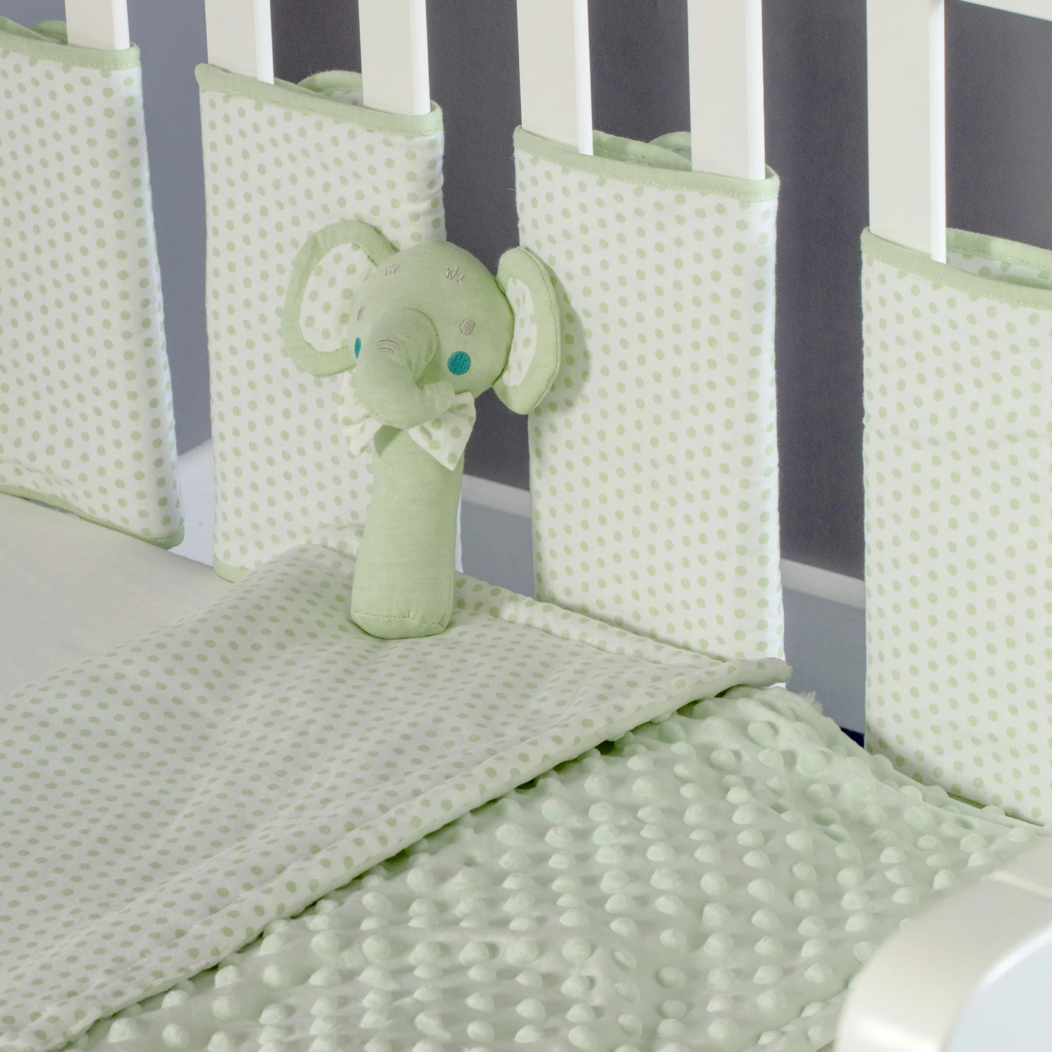 This beautiful infant bedding set is the perfect gift for any newborn baby. All the items are produced in high quality fabrics and finishes and feature the sage elephant spots design and a delightful elephant character.