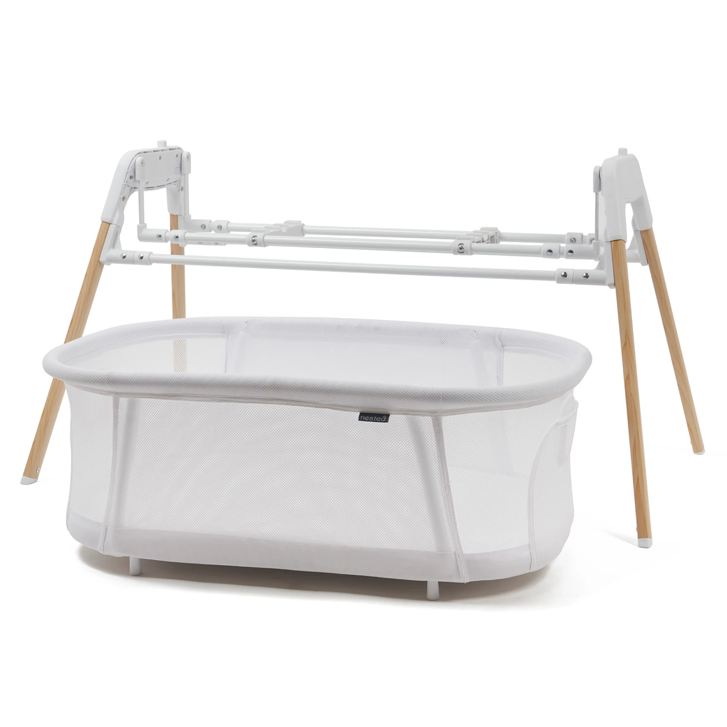 Quick and easy to assemble the Nested crib features a contemporary design with wood legs and white mesh walls that allow for better visibility and breathability for your baby. For security, the crib has an easy-to-use locking system to safely and seamlessly switch between the 3 crib modes.