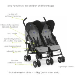 Baby Monsters Kuki Lightweight (9.8kg) Twin Double Pushchair & Raincover With Transport Bag – Black