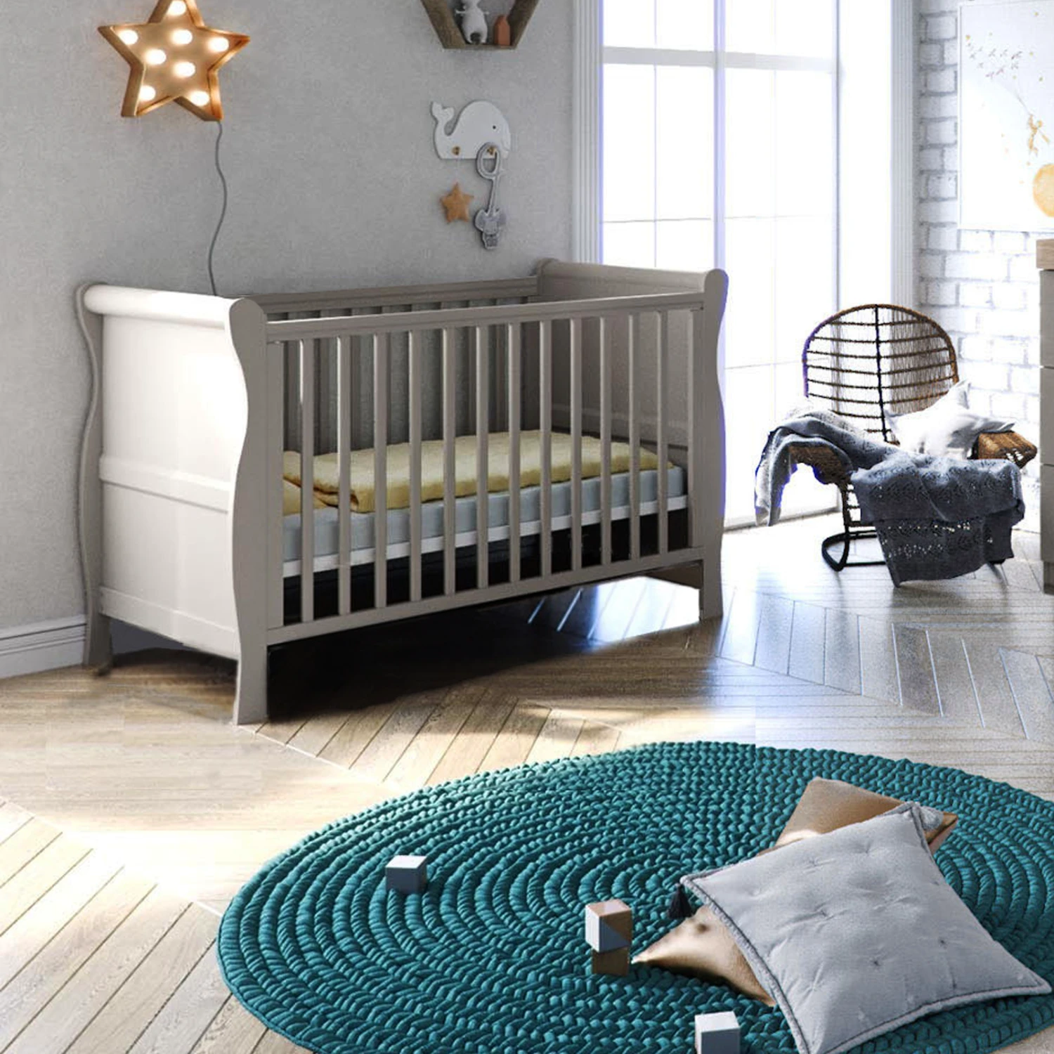 This stunning Cot Bed features a 3 position height-adjustable mattress base that can be repositioned to match your baby’s growth. The cot bed comes with added teething rails to protect your little ones gums, and protecting your furniture from little teeth.