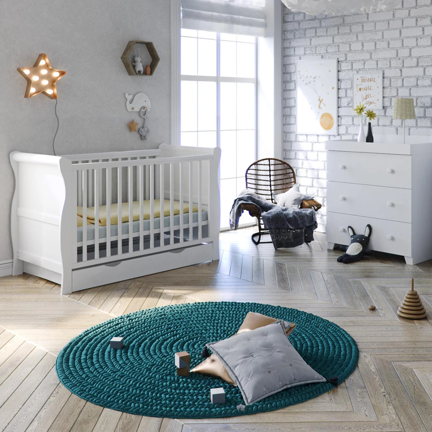 Puggle Alderley Sleigh Cot Bed 4 Piece Nursery Furniture Set With Drawer – Classic White