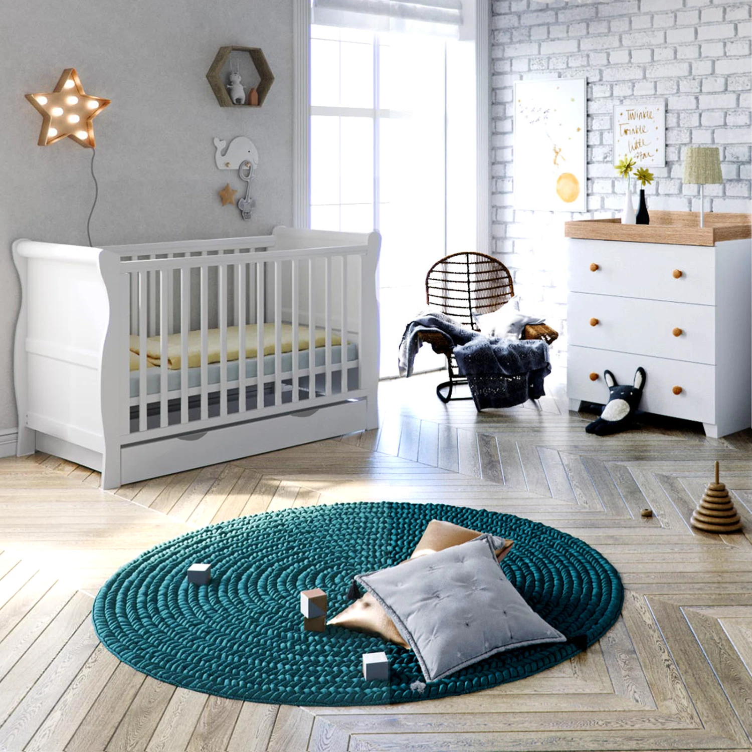 Puggle Alderley Sleigh Cot Bed 4 Piece Nursery Furniture Set With Drawer – White & Oak