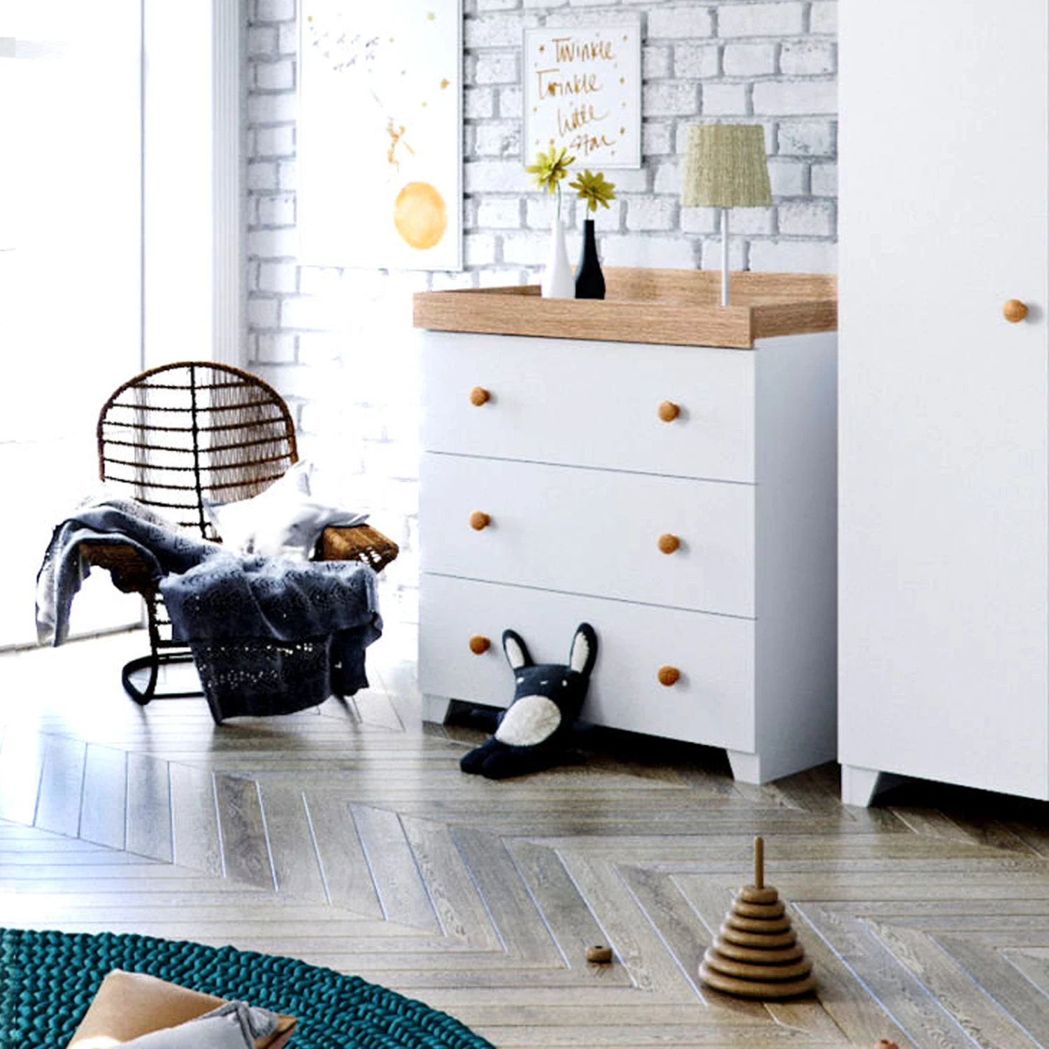 The beautiful classically styled dresser not only provides you with 3 easy-glide full-length drawers which are ideal for storing clothes or bedding, but also offers a dedicated space, at an ideal height in which for you to change your baby’s nappy. The handy changing station features a removable surround so that when your child grows too large to use the changer (around 12 months) it can still be used as a stylish set of drawers for years to come.