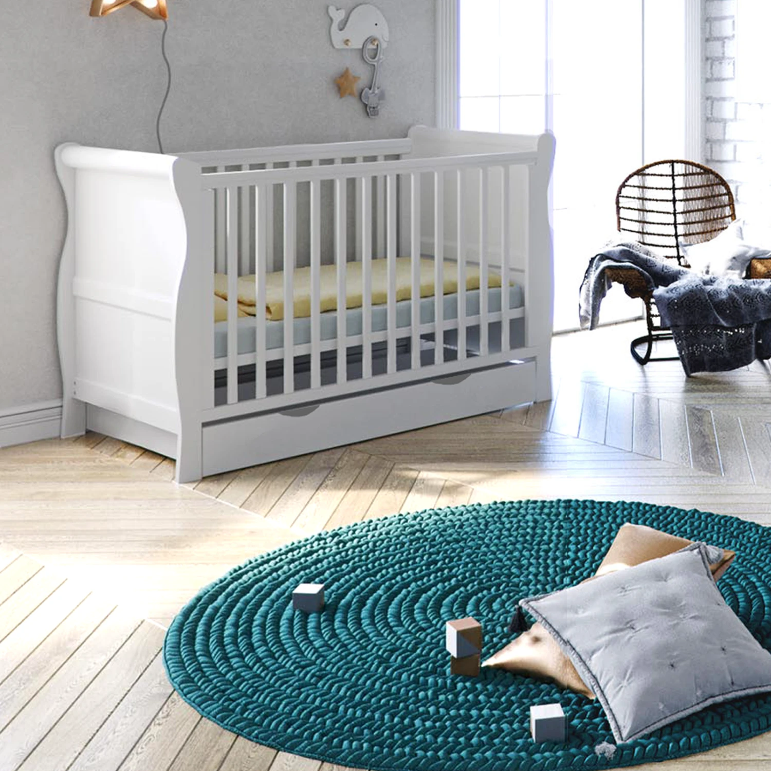 The Puggle Alderley Sleigh is a stunning cot bed which would sit perfectly in any nursery. It’s beautifully designed curved sides give an elegant finish to your nursery.