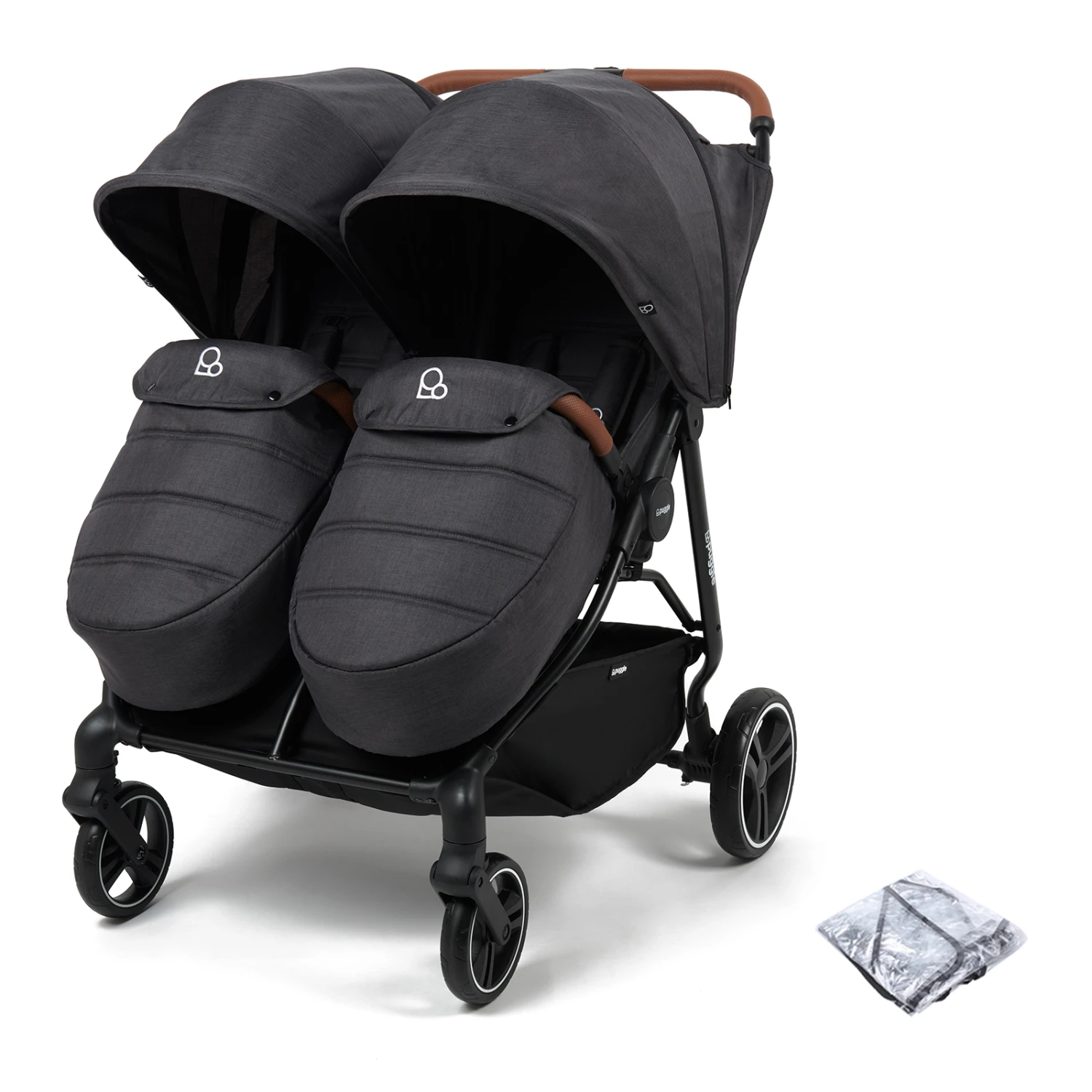 Also included with the Twin Stroller, are matching footmuffs and a twin raincover to help keep your child cosy and warm whilst blocking out the harsh weather from snow, wind and rain.